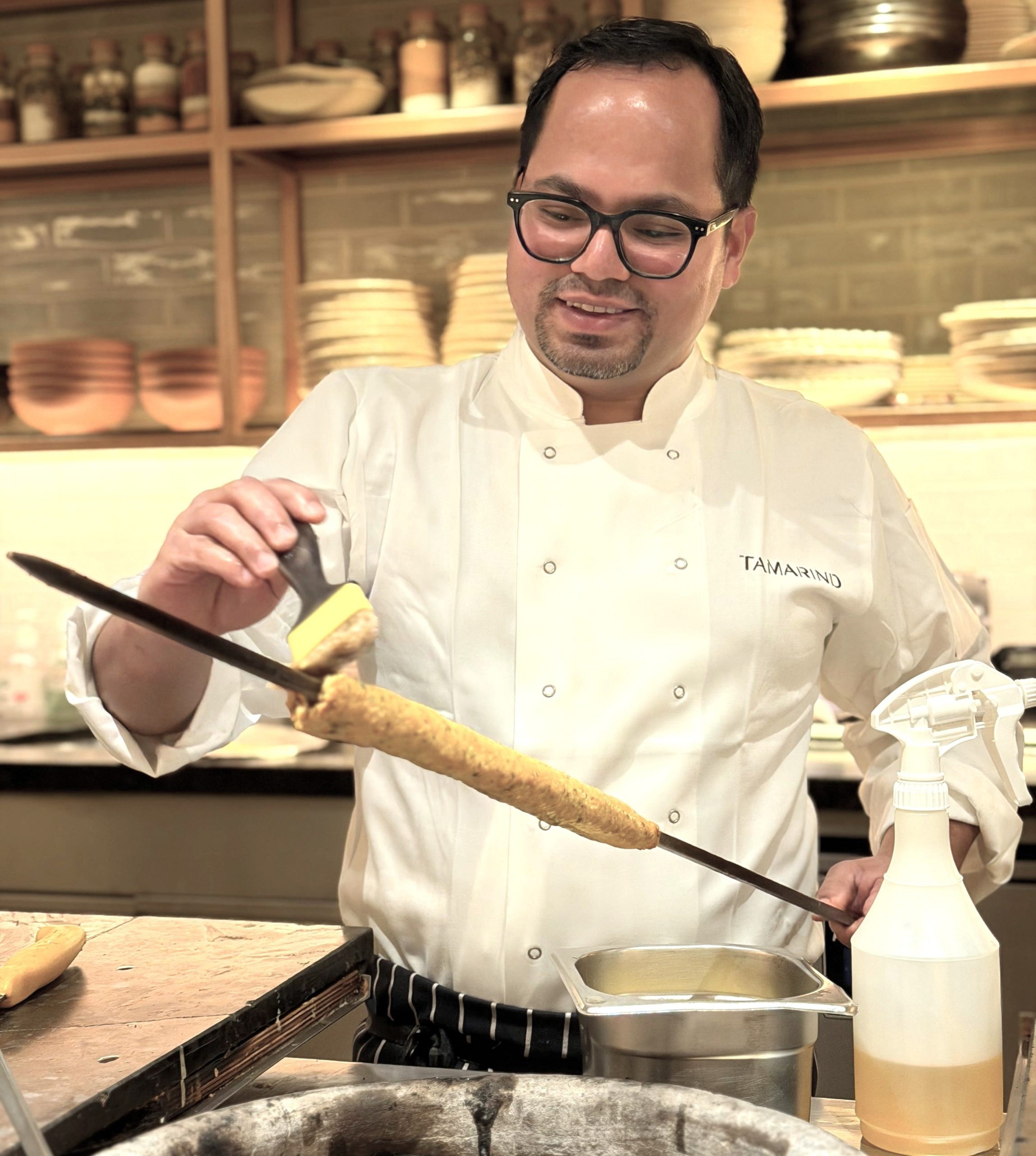 Chef Jhupa Singh Rijal preparing a sheek kebab.